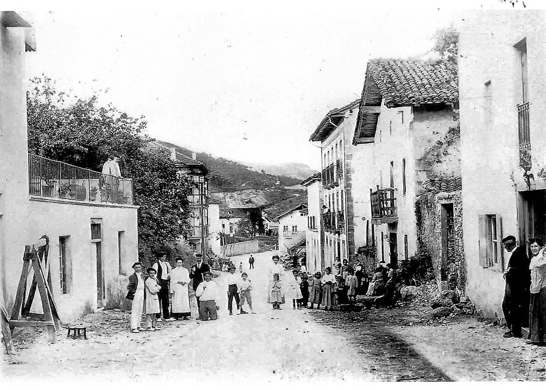 Azalpena: Oraingo Erribera kalean, “Estankero”netik plazara arteko bitartean. Herritar taldea, aguazila eta haurrak tartean, kamarari begira. Andreak etxeaurrean eserita.