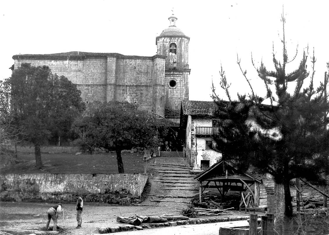 Azalpena: Gaur egungo Erribera kalea, plazatik “Estankero” etxera bitartea. Bi gizon atxurrarekin zuloak egiten platano arbolak jartzeko.