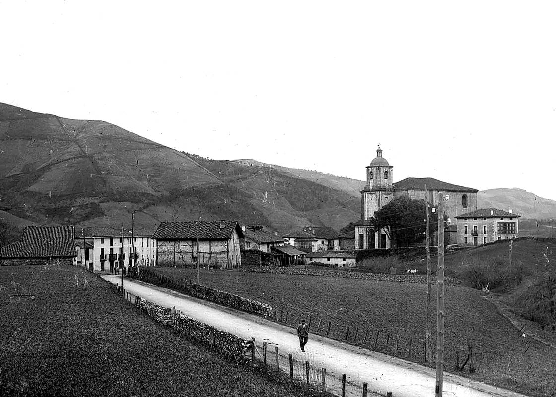 Azalpena: Erribera kalean gizon bakarra oinez, atzean eliza eta inguruko etxeak. Atzeko mendiak, zuhaitz barik.