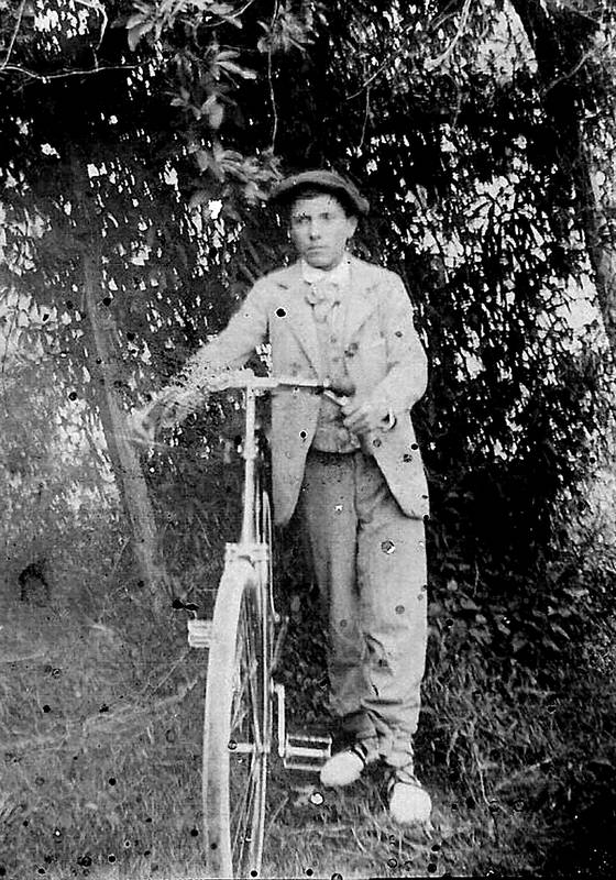 Azalpena: Simon Pagoagaren erretratua. Mutil gaztea, belar gainean bizikletarekin, kamarari begira.