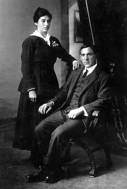 Ezkontza eguneko erretratua. Mugartegiko Rosario Arregi Urresti tente, eskua aulki adarrean, eta Jose Domingo Arriola Elgoibar jesarrita.