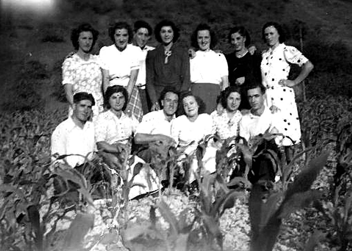 Azalpena: Taldeko argazkia, artatzan. Besteak beste, Margarita Aranbarri, Dunix Urrutia , Bitxori Aginaga, Eustakia Espilla eta Maria Laka. Makurtuta: Ramon Elordi, Rosario Aginaga, Domingo Espilla, Agustina Galdos, Pakita Elordi eta Julian Argoitia.