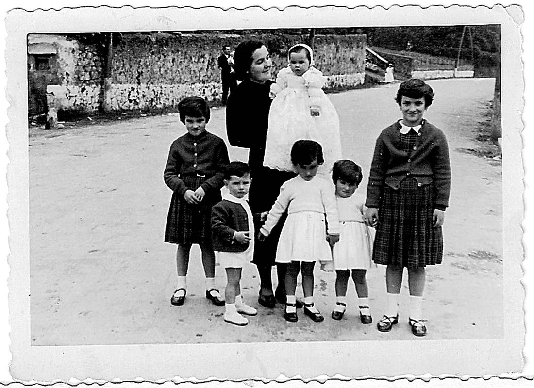 Azalpena: Erribera kalean, Rosarito Aldazabal Gasparreneko sendiarekin, Erribera kalean, Zentrala parean. Besoetan umea, eta inguruan neska mutikoak.