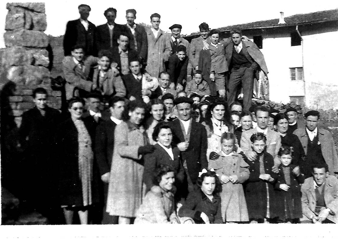 Patxikolino etxe alboan. Besteak beste, goian: Tomas Gandiaga eta Juan Kaltzakorta. Behean: Martzelina Arriola, Jose Mari Bereikua, Agustina Galdos, Milagros Gojenola, Jose Mari Elustondo, Fernanda Kaltzakorta, Sabin Elustondo, Katalin Alegria eta Manuel Kaltzakorta. Aurrean: Eustakia Kaltzakorta, umeak eta Juan Elustondo.