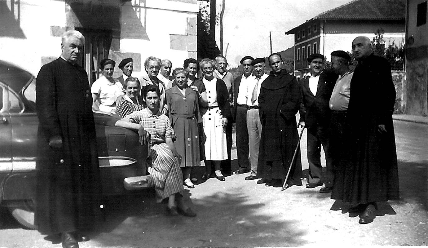 Erribera kalean, Kafeko aurrean, urtebetetzea ospatzen. Abadeak eta herritarrak, auto baten ondoan: Don Juan Zalloetxebarria, Antonia eta Felipa Pagoaga, Lucia Basterretxea, Plaza eta bere emazte Dora, Lucia Sagasti, Juan Antxustegi Juniko, Román Galdos, Juan Egurrola, Aita Alejandro, J.Manuel Arriola, Domingo Mugartegi eta Don Pedro Zalloetxebarria eta beste hiru lagun