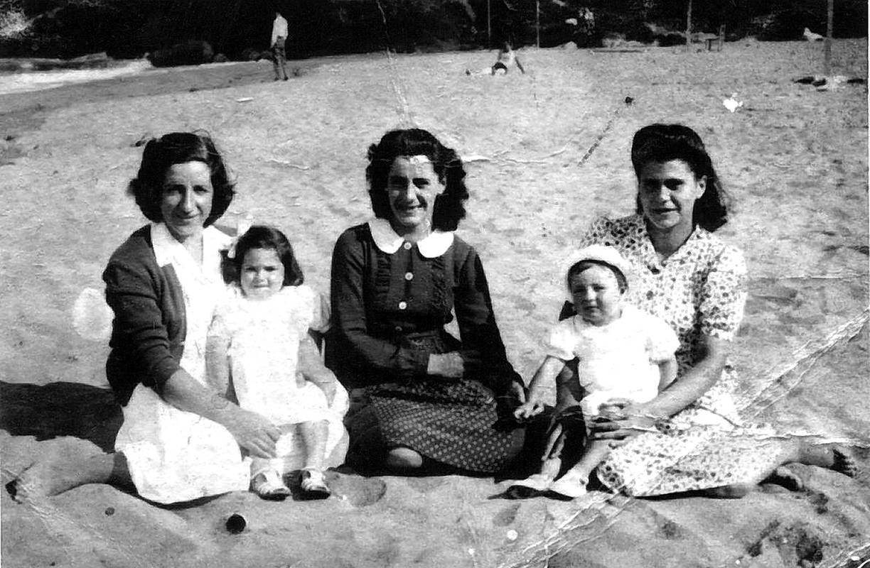 Azalpena: Neska lagun taldea eta umeak hondartzan. Bittori eta Maria Arangurena ahizpak eta Miren Aspiazu. Umeak: Amalia Aristondo eta Loli Elordi.