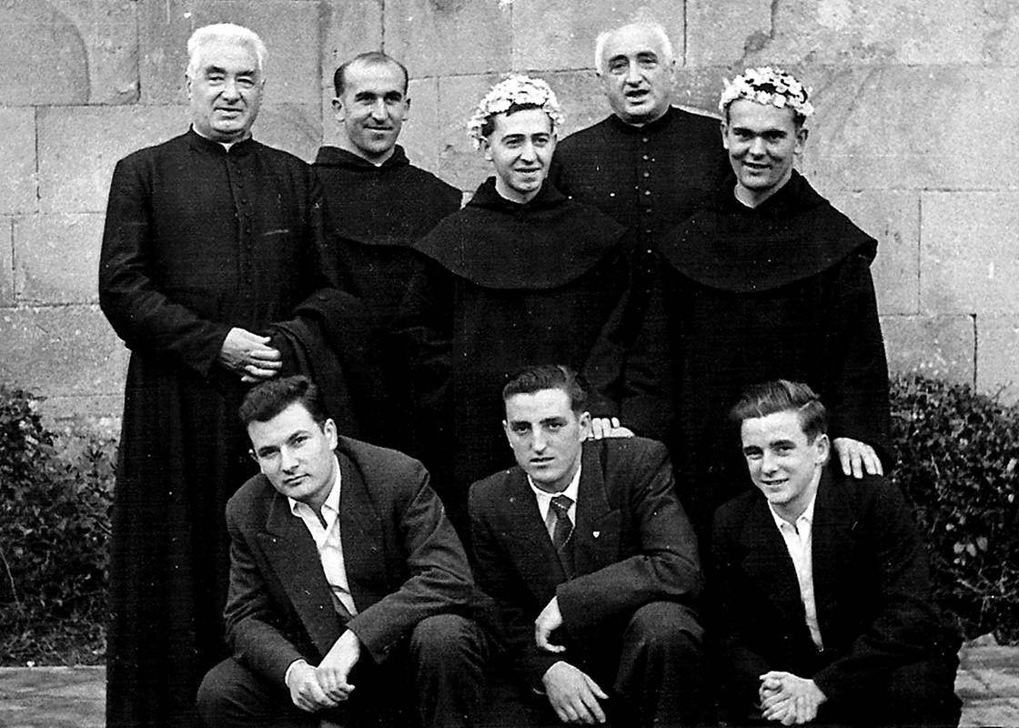 Kepa Bilbao eta Pedro Arriola, nobiziatu egunean, abade eta lagunekin, Larreako Karmelon