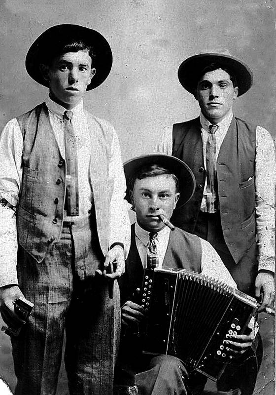 Hiru gizonezko. Erdian eserita, eskusoinuarekin