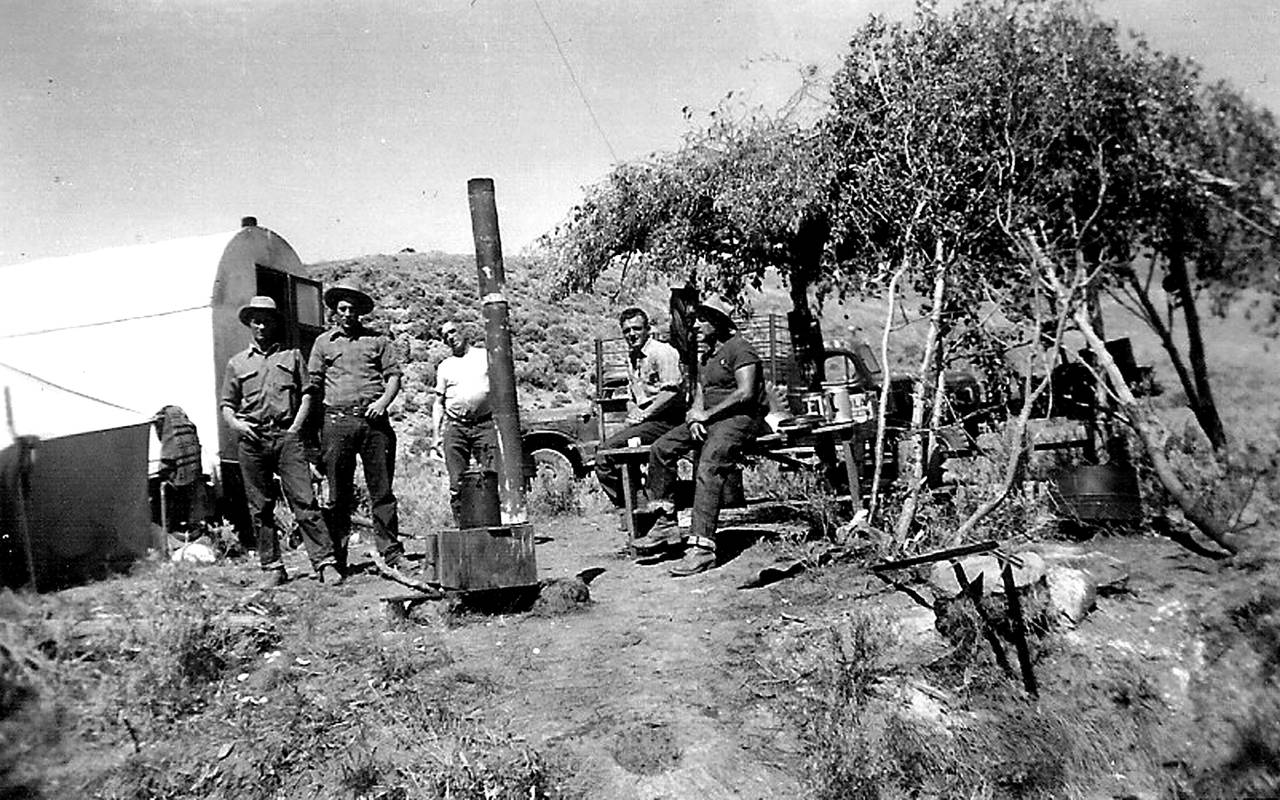 Azalpena: Elkon, Nevadan (AEB-n). Cesareo Eizagirre eta bere lagunak, artzain. Karrokanpoa atzean.