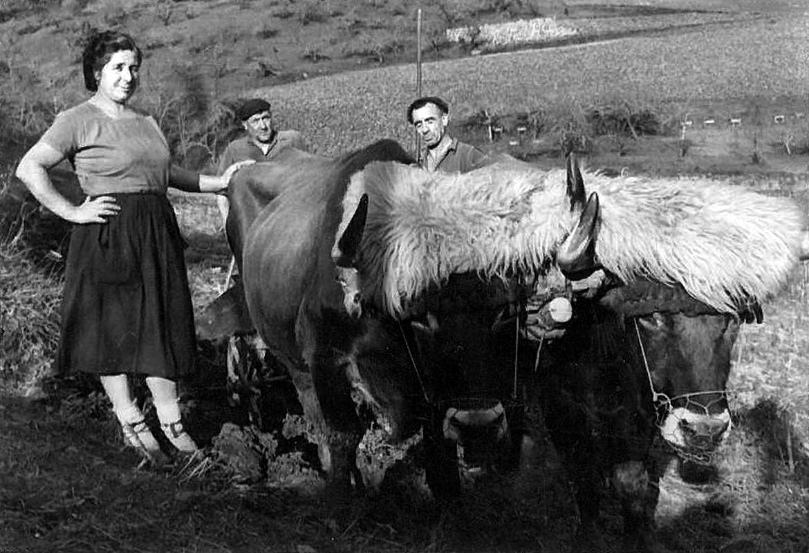 Soloan. Andramarixe baserriko soloetan. Paquita Elordi, Ciprian Argoitia eta Julian Argoitia idi parearekin lurra lantzen