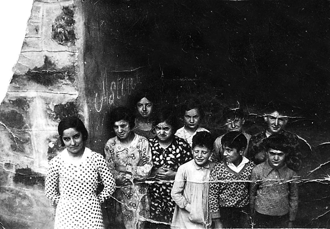 Asterrikako auzo-eskola. Neska-mutilak kamarari begira. Aurreko ilaran: Blanca Irusta Zabala Serotetxe, Maria Kaltzakorta Azpiri Allukiz, Miren Irusta Zabala Serotetxe, Jose Kaltzakorta Azpiri Etxano, Pedro Maria Maguregi Bereikua Kondetxebarri, Luis Anakabe Garro Anakabe. Atzeko ilaran: Juana Garramiola Irusta Burgain Goiko, Purificacion Anakabe Garro Anakabe, Jose Maria Maguregi Bereikua Kondetxebarri, Pascual Kaltzakorta Azpiri Etxano.
