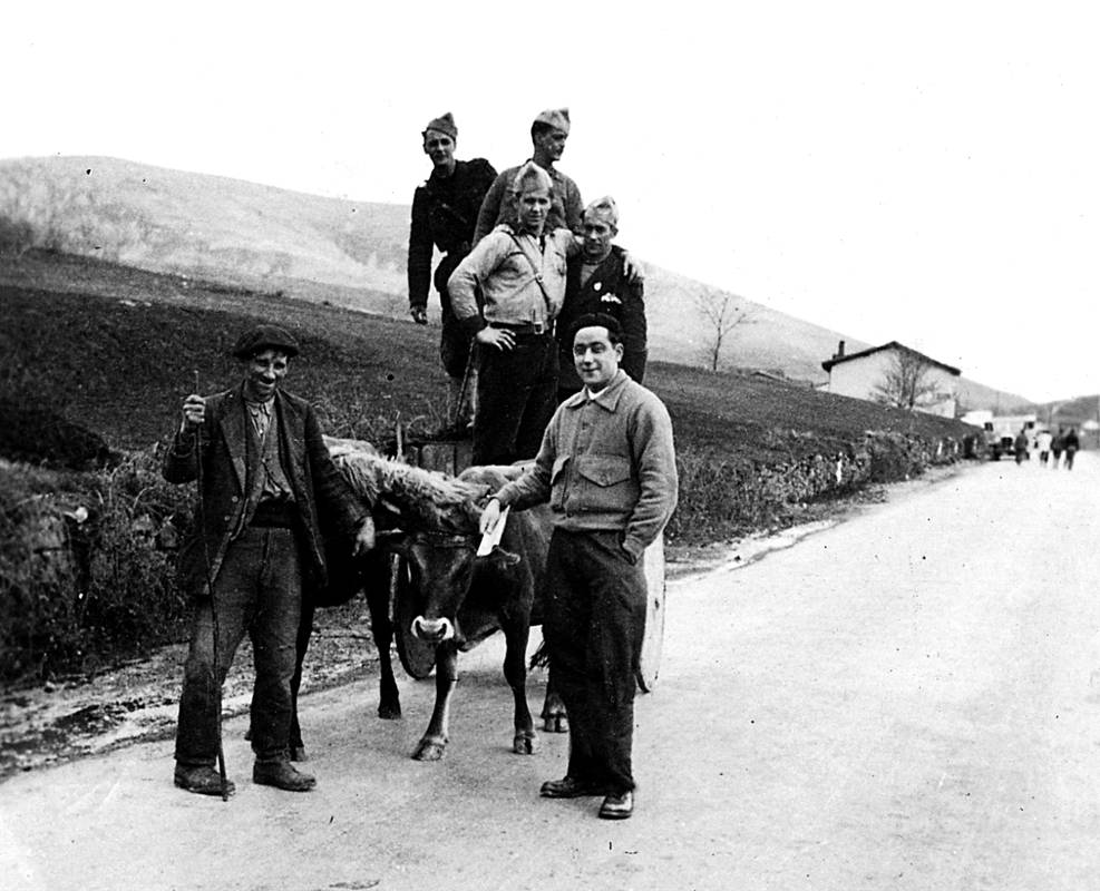 Badirudi, gizona gurdiarekin dagoen argazkian, herritar bat, bere ondasunak gurdian bildu eta alde egiten ari dela. Berriatuko herritar asko, Amorotora joan ziren babes bila.