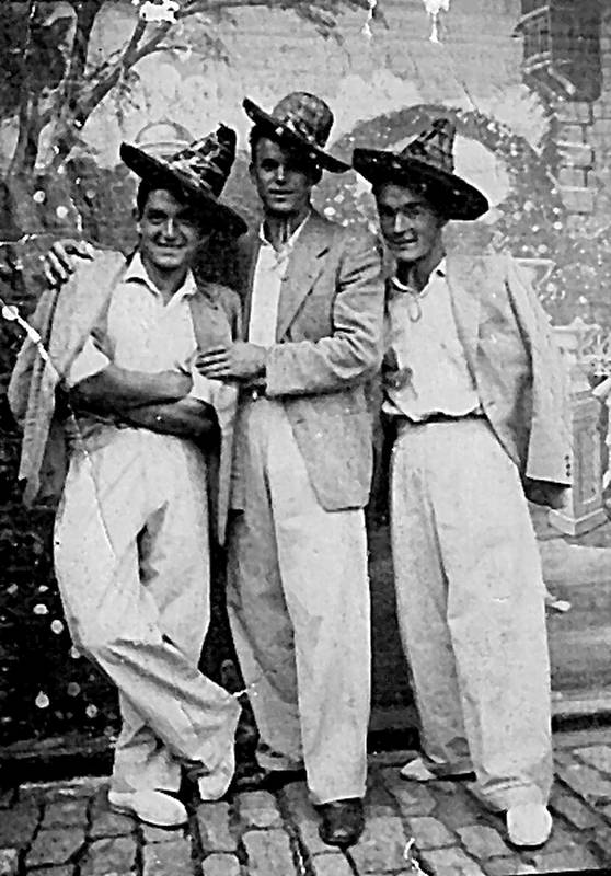 Jaiak. Santa Eufemin. Matias eta Jose Ugarteburu anaiak; erdian, Juan Kaltzakorta, mexikarren sonbreroekin