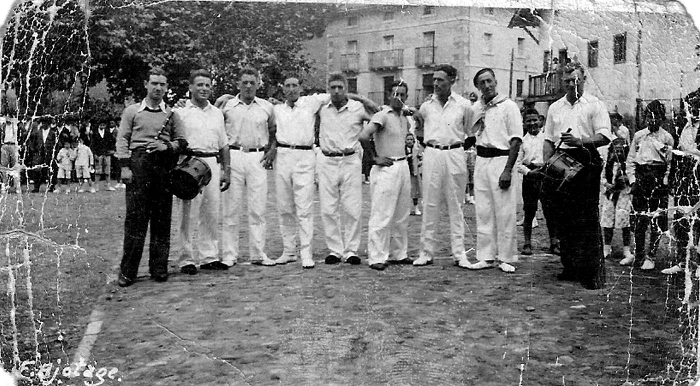Jaiak. Berriatuko plazan dantzariak, taldeko argazkia, kamarari begira. Txistularia eta bere ondoan Adrian Elordi, Sesareo Kaltzakorta, Pedro Egurrola, Teodoro Elordi, Franzisko Goenaga Binda, Roman Egurrola, Txomin Unamunzaga eta Jose Mª Eizagirre tanborrarekin.
