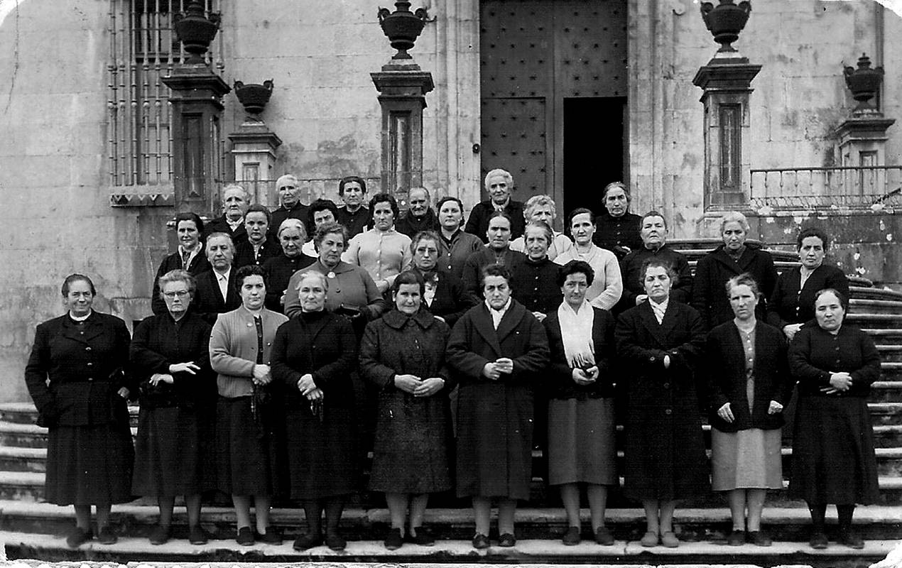 Gogo-jardunak Loiolan. Emakume taldea, eliza aurreko eskaileretan. Besteak beste, beheko ilaran: Rosario Arregi, Serapia Urizarbarrena eta Marzelina Arriola. Erdian: Eustakia Espilla, Donata Kaltzakorta, Eufemia Malaxetxebarria eta Maria Eizagirre. Goian: Carmen Elordi, Eustakia Bastida, Katalin Alegria, Rufina Eizagirre eta Ventura Goiogana.