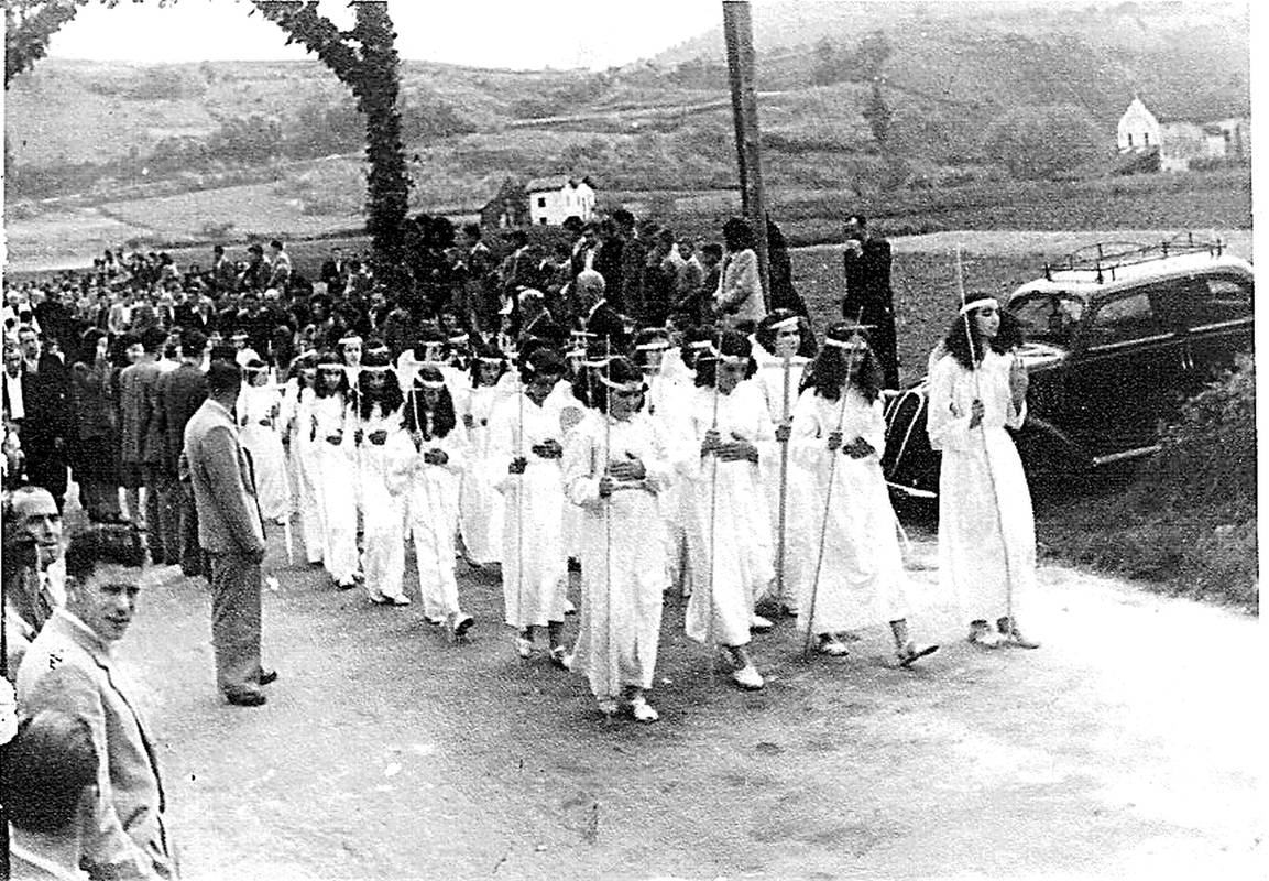 Beheko kalean, Begoñako Ama etorri zenekoa. Aingeru jantzita gaztetxoak