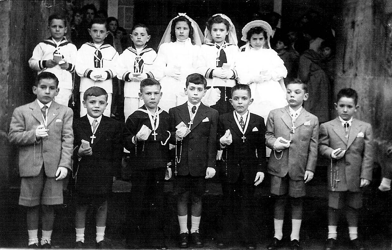 Lehen jaunartzea egindako umeen taldea. Atzean: Julian Bereikua, Simon eta Luis Laka bikiak, Blanquita Plaza, Maria Angeles Elordi eta Maria Luisa Unamunzaga. Aurrean: Juanito Plaza, Xabier Garate, Inazio Gorostola, Franzisko Xabier Itza, Pedro Alzibar, Juan Arriola eta Jose Luis Alegria.