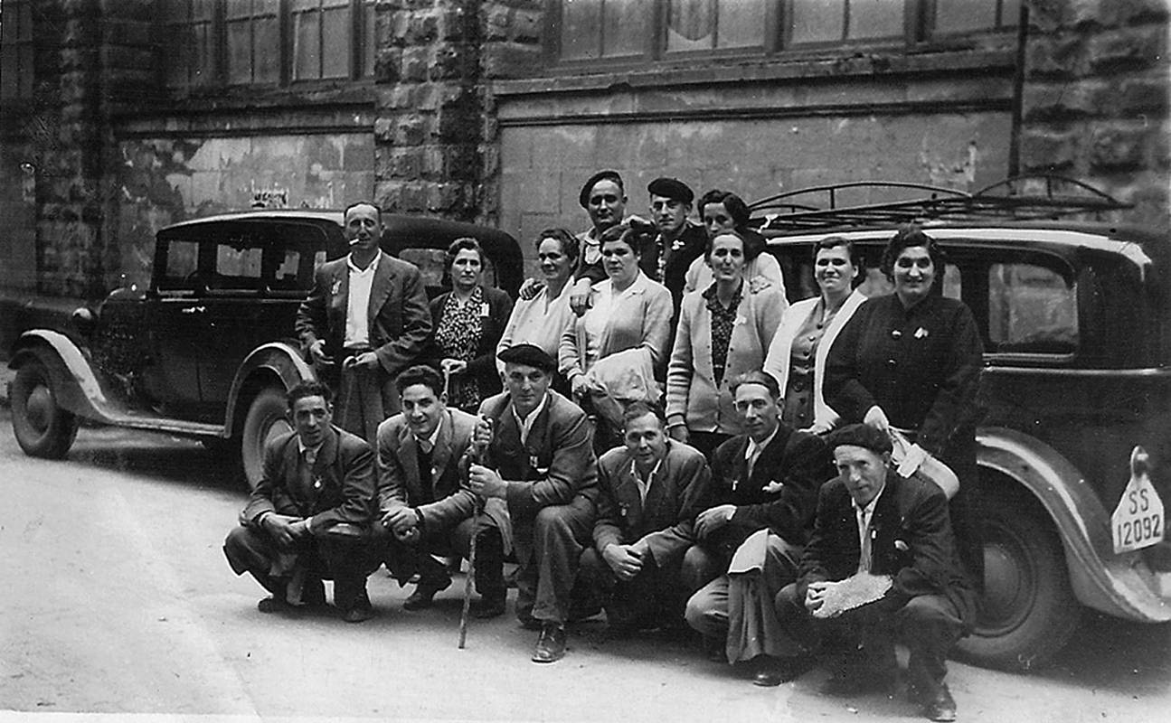 Urkiolan. Patxi Urrutia eta Maria Eizagirre , Xalbador Barruetabeña eta Maria Madalena Alkorta, Hilario Sololuze eta Ines Gisasola, Justa Erkiaga eta Patxi Eizagirre, Petra Laka eta Jose Mª Bilbao, Pia Anitua eta Inazio Gorostola, Josefa Inazia Laka eta Jose Mª Plaza. Makurtuta ezkerrean: Eusebio Elu Garro eta beste taxista bat.
