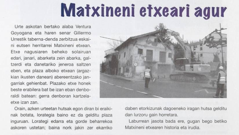 Matxienea, denda eta taberna izan zen urte luzez. Gillermo Urresti, ondarrutarra, eta Bentura Goiogana, berriatuarra, ziren bertako jabeak. Kasadua edo Kauenea baserriko jabeak ere baziren. Etxe nagusian, taberna eta denda zeuden, janaria, jantziak eta baserriko tresnak saltzen ziren bertan. Plazara begirako etxean gordetzen zituzten ongarria, pentsua, lastoa eta baserrietarako tresneria.